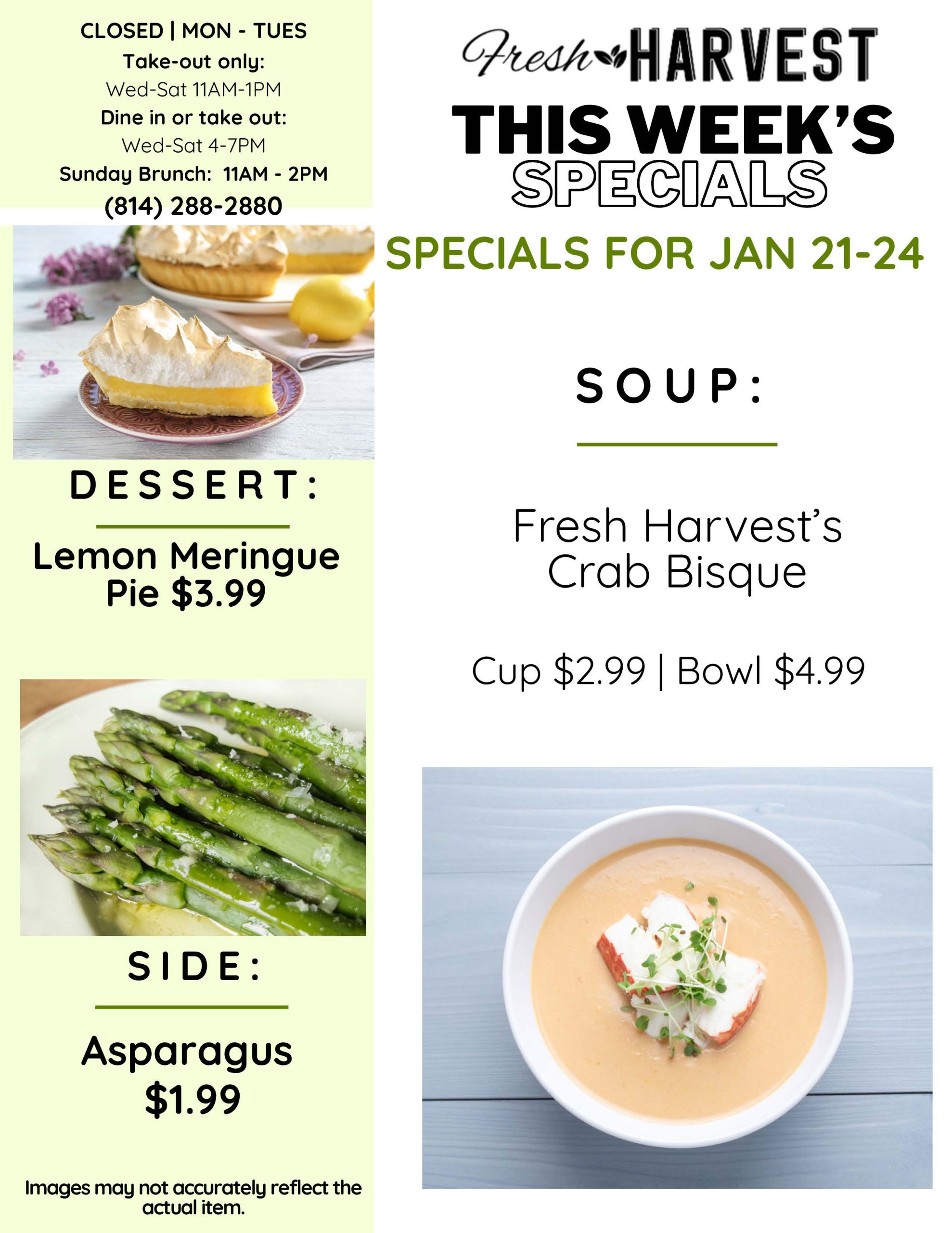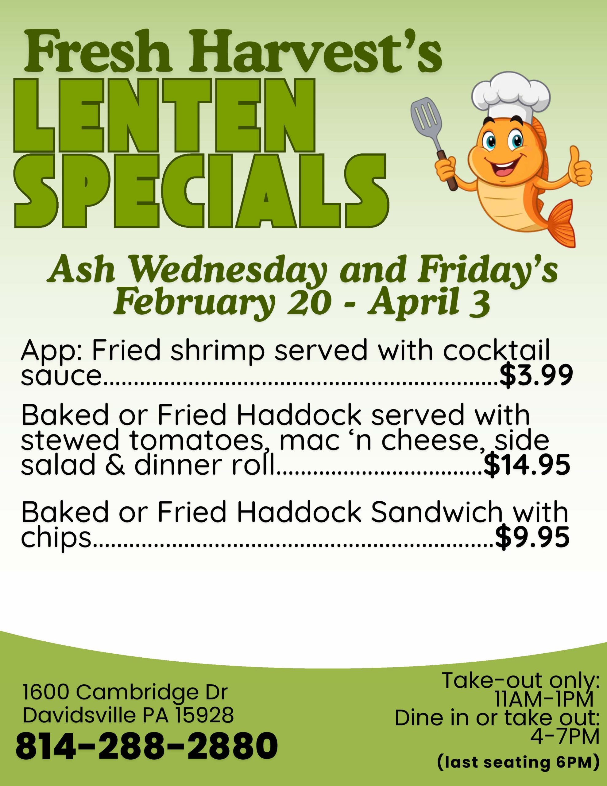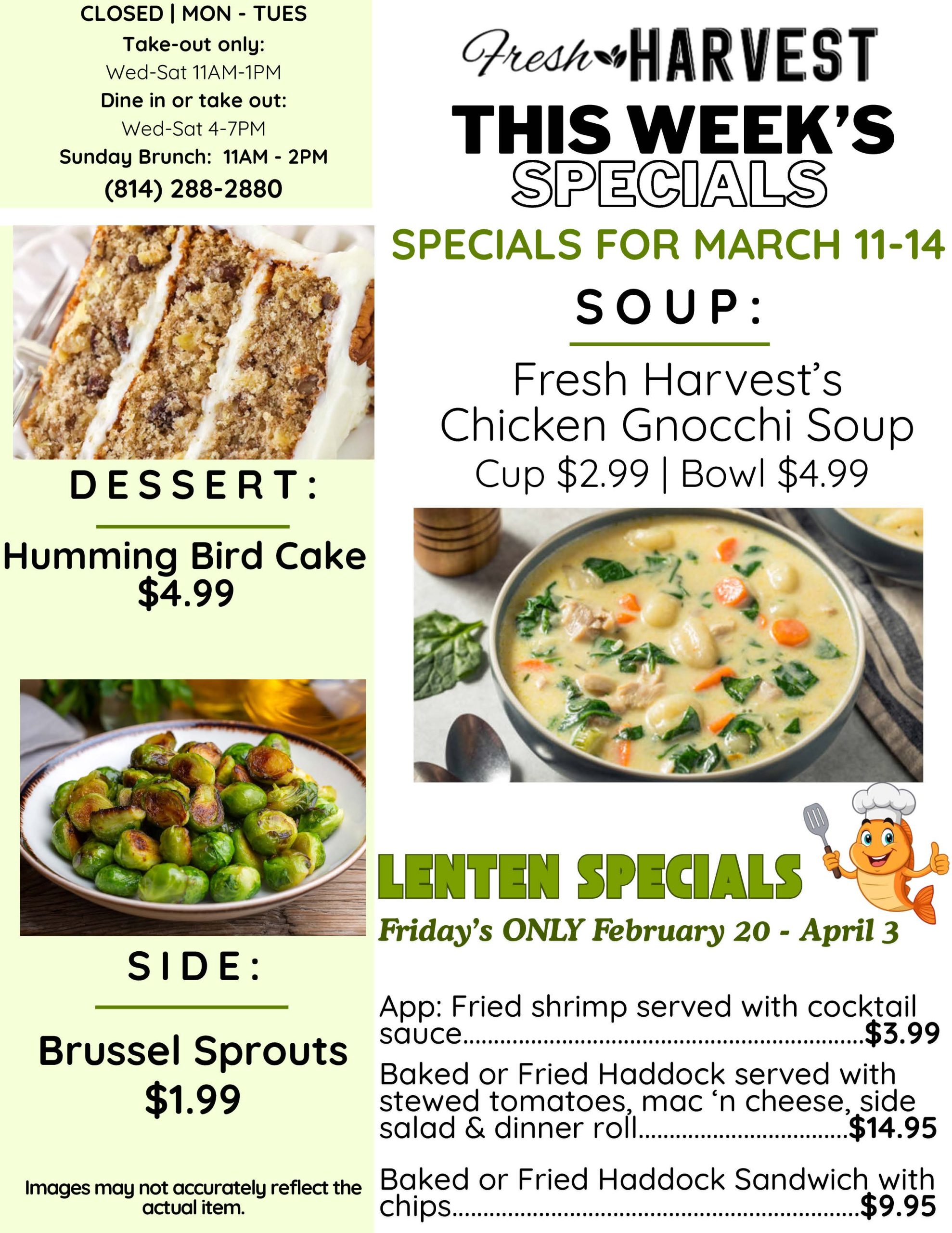Get ready for a delicious adventure at Fresh Harvest! Alongside our tantalizing menu and special seasonal selections, we’re thrilled to bring you a sensational weekly special every Wednesday through Saturday! Imagine savoring a brand-new appetizer or indulging in a delightful dessert that changes each week! The possibilities are endless, making each visit an exciting culinary journey you won’t want to miss!